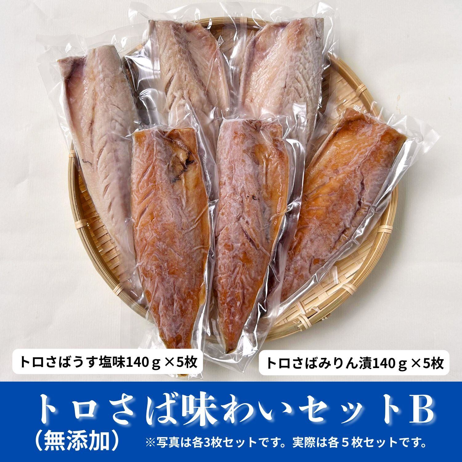 「無添加トロさば味わいセットB」は、家庭で手軽に美味しいさばを楽しむことができる絶品のセットです。さばみりん漬け140g×5枚とさば薄塩味140g×5枚を組み合わせたお得な内容です。